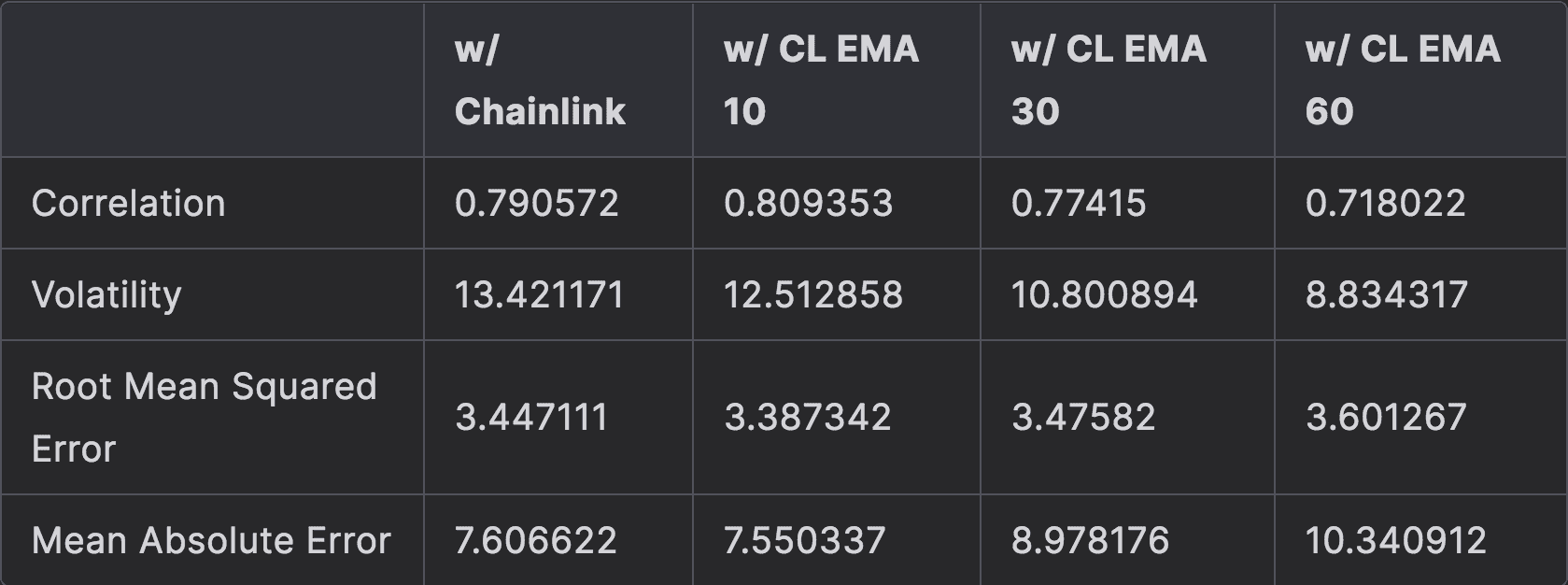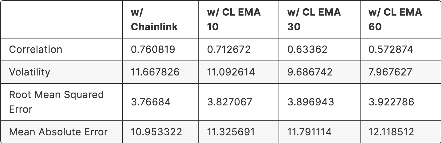 Surprisingly, the 10-period EMA exhibited a higher correlation with the spot price and a lower magnitude of error compared to the raw Chainlink feed, a phenomenon not observed in the previous analyses. Therefore, there is concern that the 10-minute EMA period may still be excessively volatile, and a 30-minute period is deemed more appropriate.