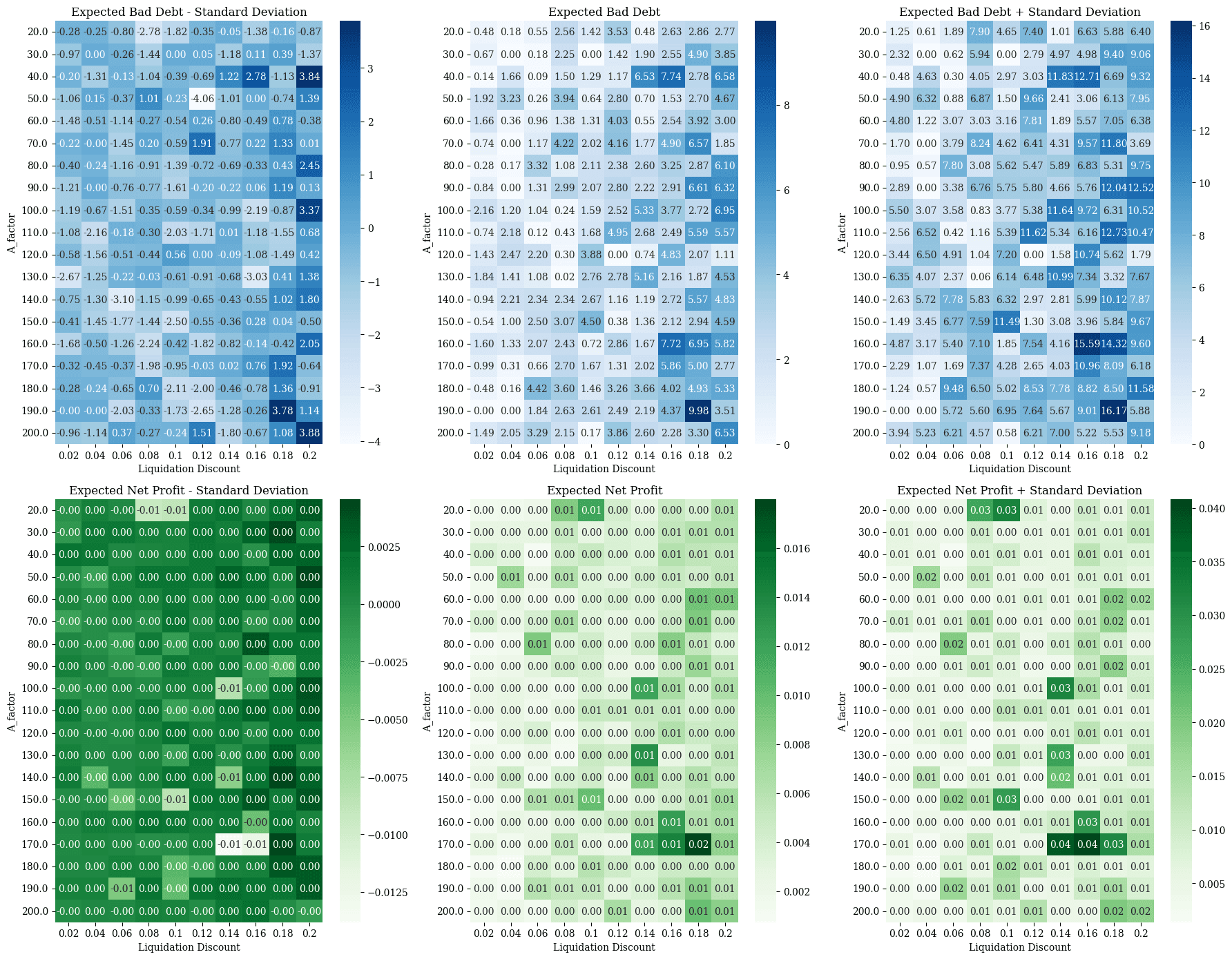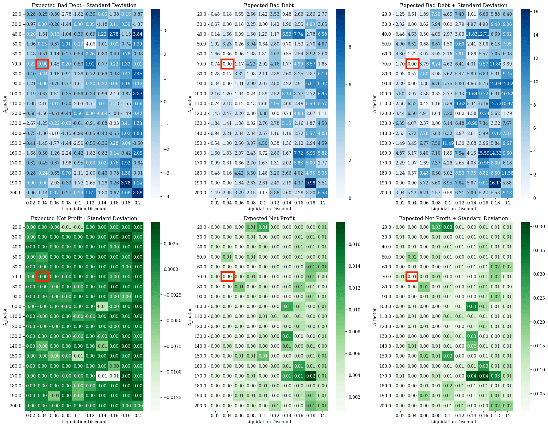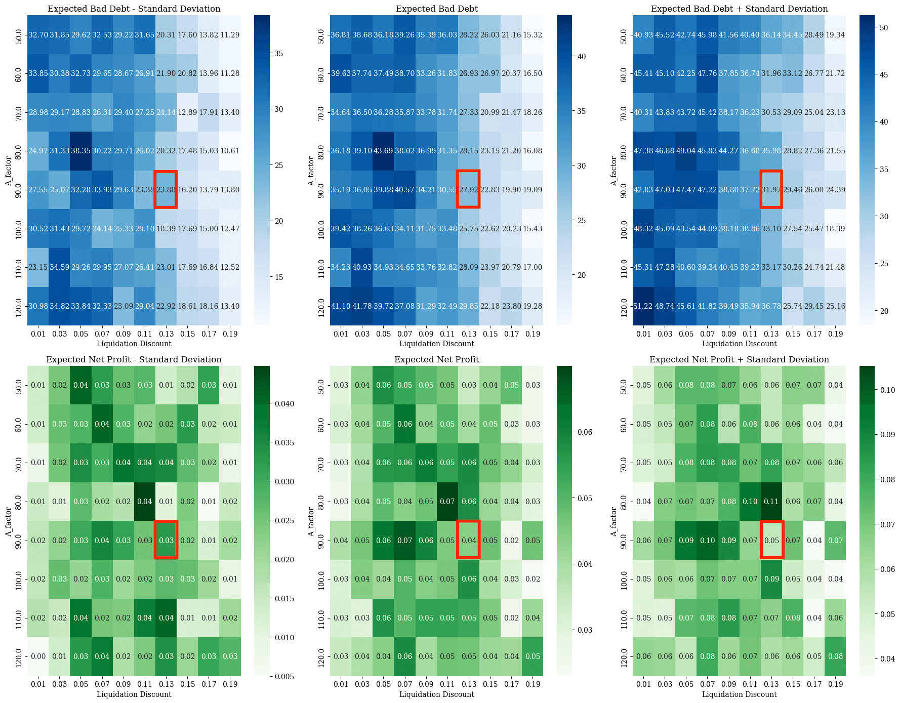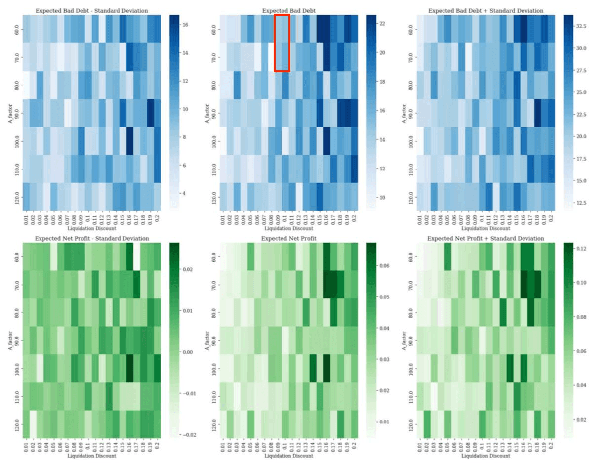 Results show a trend of progressively favorable bad debt accrual as liquidation discount increases whereas net profit tends to maximize around A=70-90 and liquidation discount between 0.05-0.13. We select A=90 and liquidation discount=0.13 as a suitable balance between these factors.
