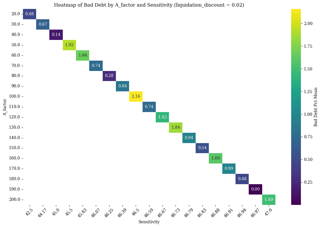 Hence we begin our analysis with a liquidation discount of 0.07 as a viable liquidation discount. Subsequent heat maps test at progressively higher liquidation discounts.