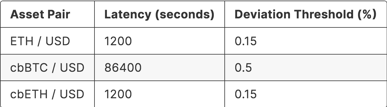 The cbBTC oracle, however, raises some concerns. The deviation threshold is notably higher than the other USD-paired feeds, as is the latency, which demands extra attention regarding the reliability of this oracle.