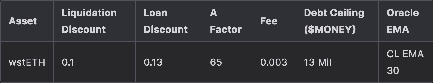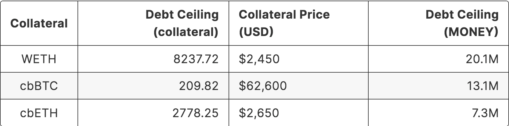 The debt ceiling is determined based on the collateral sale price impact (cf. section 4.2 in final report). The table below denominates the recommended slippage tolerance defined by our methodology into MONEY for convenient cross-comparison between liquidity depth and to set a safe debt ceiling for the respective markets. Exposures are calculated by a recent price quote on October 15, 2024 and recommended values are subject to fluctuation depending on the liquidity depth and price trajectory of the collateral assets.