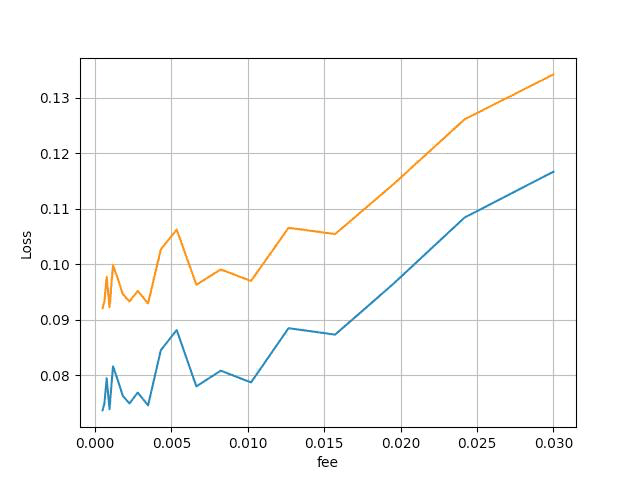 Hard to see a clear pattern Fee: 0.002 - 0.003 (by focusing on narrow ranges)
