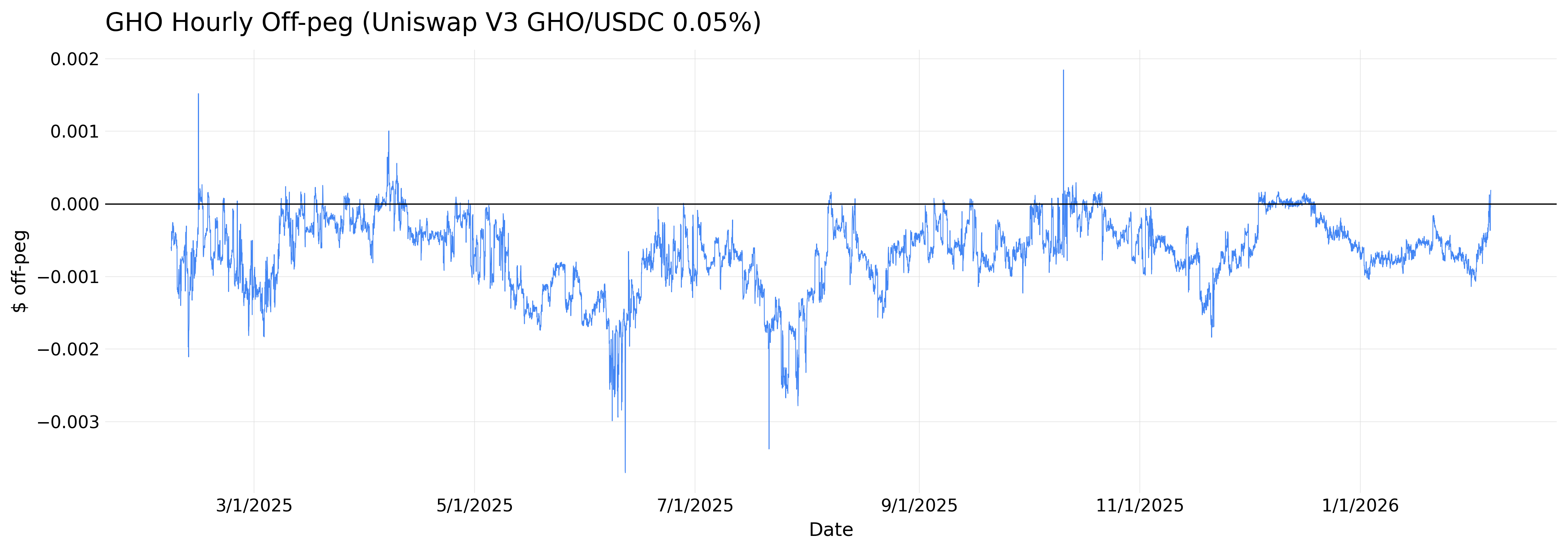 Tail risk: At the 99th percentile, USDC remains tightly anchored (3.3 bps), while PYUSD, frxUSD, and USDT show moderate tails (~10–16 bps). GHO exhibits the heaviest tail (21.6 bps), though none of the assets breached 50 bps. GHO's weakness reflects more frequent moderate deviations rather than extreme peg breaks.