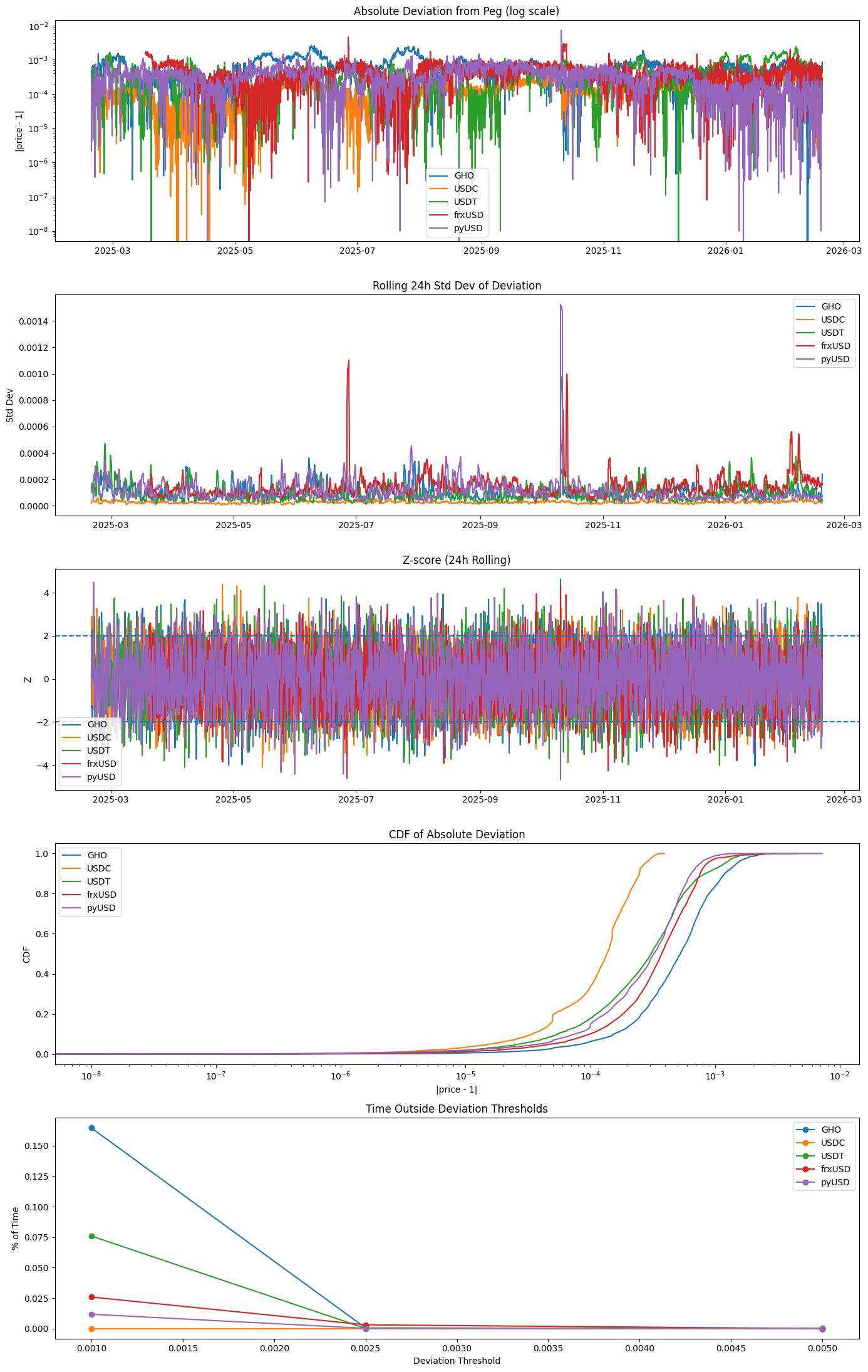 This analysis evaluates historical peg performance across USDC, USDT, frxUSD, and GHO using hourly price data sourced from Pyth. Prices were normalized to a $1 peg. For each asset, we computed the deviation from peg (price − 1), absolute deviation, rolling 24-hour standard deviation, and rolling z-scores (mean-adjusted). We further measured tail quantiles and the proportion of time spent outside fixed deviation thresholds (10, 25, and 50 bps). All statistics are based on hourly closes and comparable time windows across assets.