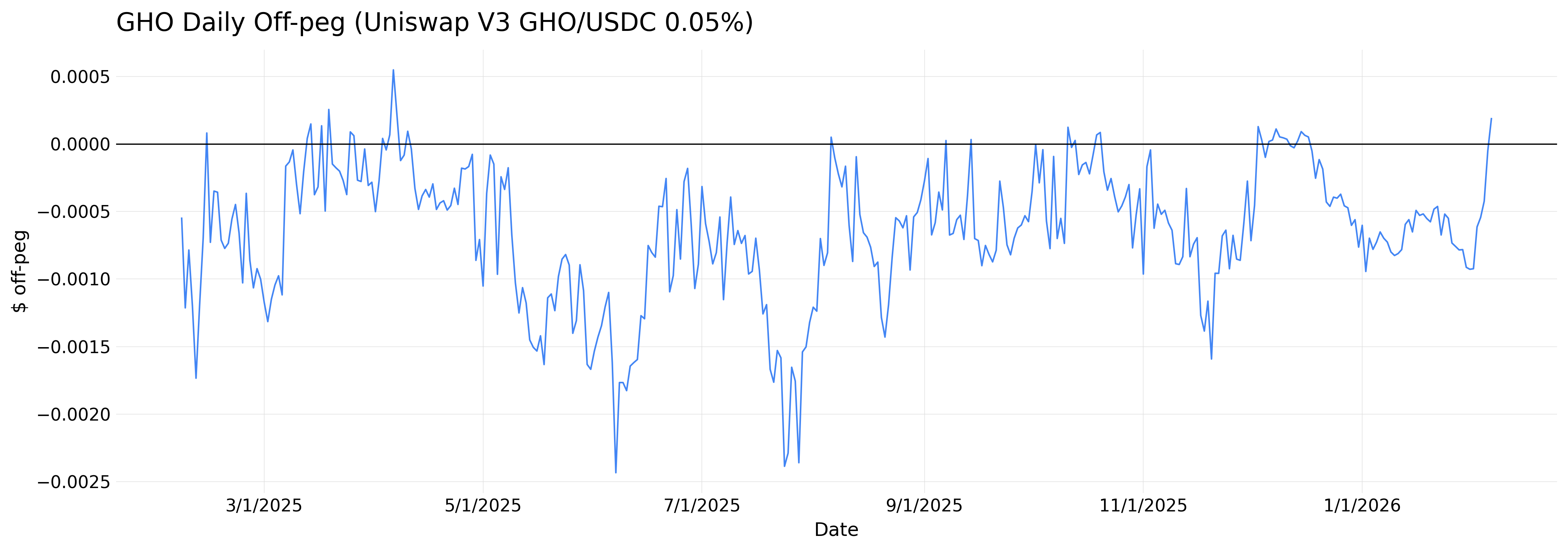 Structural stability: Rolling 24-hour volatility is lowest for USDC (0.27 bps), followed by USDT (0.94 bps), PYUSD (1.1 bps), GHO (1.02 bps), and frxUSD (1.45 bps). GHO is not the noisiest asset; its peg is consistently wider rather than unstable.