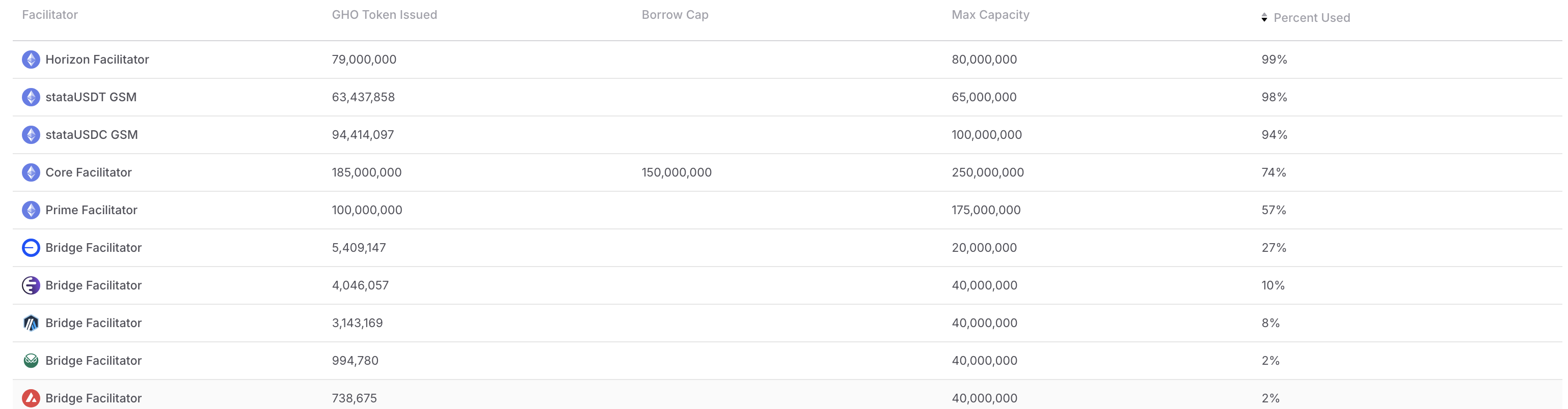 | GSM Facilitator | Underlying Token | Holdings | GHO Minted | Bucket Cap | Utilization |