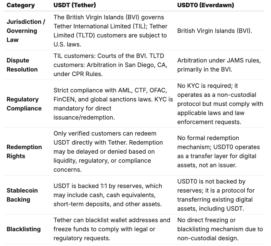 Differences in the binding terms governing USDT and USDT0 underscore key legal distinctions: