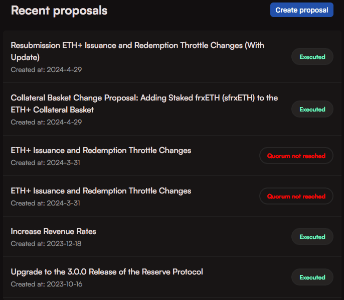 ETH+ governance forum reveals seven RFC discussions, while a total of seven proposals proceeded to on-chain voting. Generally, proposals receive unanimous support from the voting participants, leading to their successful execution. The exception was a vote to increase issuance and redemption throttles that would allow larger scale activity on the RToken. The initial vote did not receive quorum, but was resubmitted, citing widespread community support for the proposal.