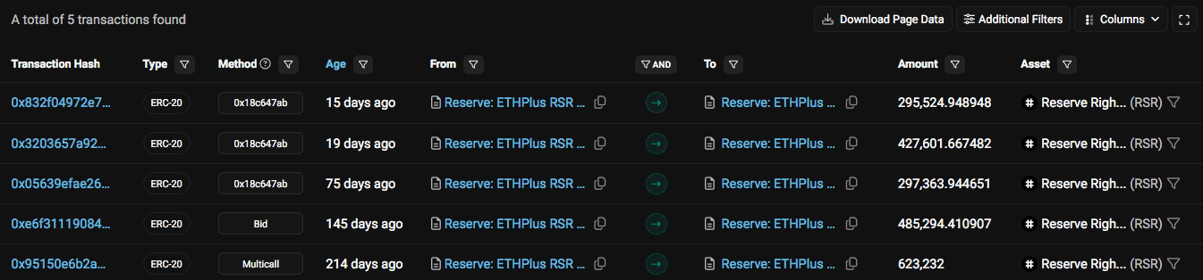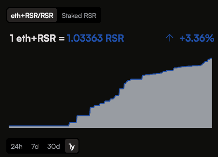 Revenue distribution to RSR staked on ETH+ can be gleaned from the increase in the ETH+RSR/RSR exchange rate over time. This represents the portion of the revenue that is auctioned for RSR and distributed to stakers.