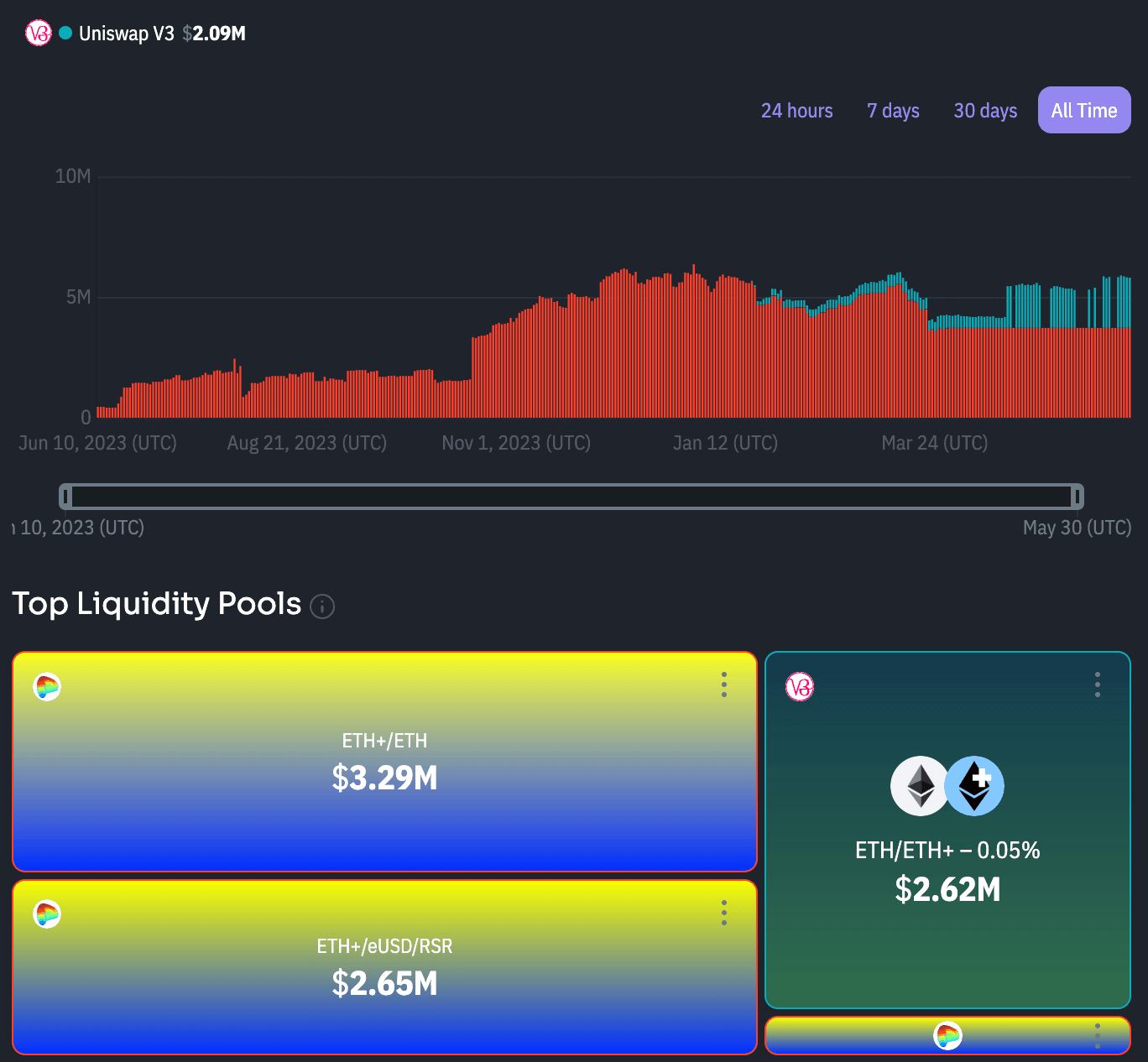 Market Maturity: Reserve has adopted a liquidity strategy that involves governance power in Curve and protocol owned liquidity, which has reinforced a stable trend of reliably available liquidity. The reliance on a single venue has been addressed with recent diversification to Uniswap and across multiple DEX pools. ETH+ has been in a robust growth trend for several months in terms of TVL and network adoption metrics, but its liquidity depth has not matched this growth. These are not unusual circumstances for emerging assets and ETH+ shows a generally positive trajectory, but nevertheless, continuous monitoring of the ETH+ market is necessary to ensure the continuation of healthy growth trends.