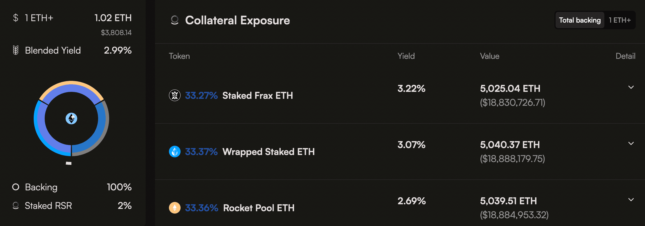 See the ETH+ Backing and Risk section in the Reserve app for additional information, including the RToken exposure to various DeFi protocols in real-time.