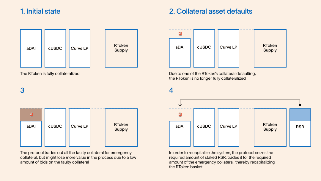 In case either collateral type experiences a default, as determined by an Oracle price feed, the protocol will replace the defaulted collateral type with the designated emergency collateral. This is currently set to WETH.