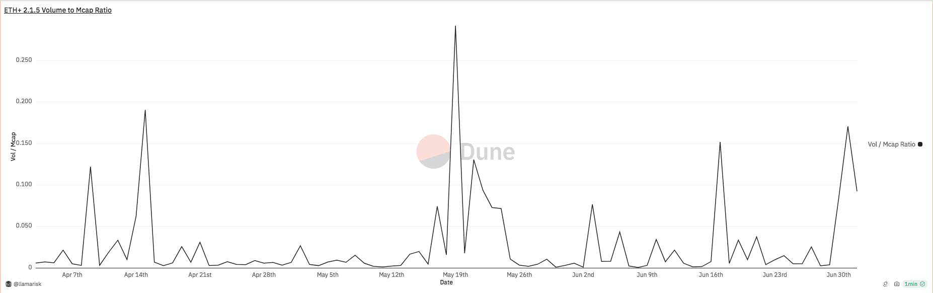 Notice in the image above that ETH+ is also overcollateralized by RSR, which is staked to ETH+ for governance rights, to earn a portion of fee revenue, and as a backstop in case of collateral default. This mechanism is reserved as the final protection and the amount of RSR overcollateralization may contribute to confidence in the overall basket. See above the figure above shows 2% overcollateralization on May 30, and below the amount of RSR staked on ETH+ over time.