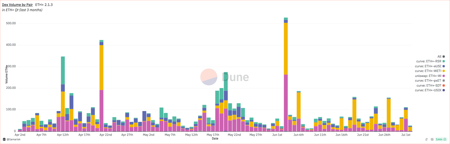 ETH+ has experienced a healthy growth trend over recent months in terms of ETH inflows to the system. The majority of liquidity is concentrated on Curve, an exchange known for prioritizing deep liquidity, although the limited market diversity may increase the risk that its dependence on Curve may make it vulnerable to issues specific to that venue.
