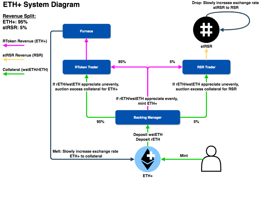 Simply put, ETH+ is intended to be an interest-bearing ETH token backed by several liquid staked ETH assets. How the mandate is interpreted is at the discretion of RSR stakers on ETH+ who can authorize upgrades, changes to collateral makeup and changes to parameters within ETH+ through on-chain governance.