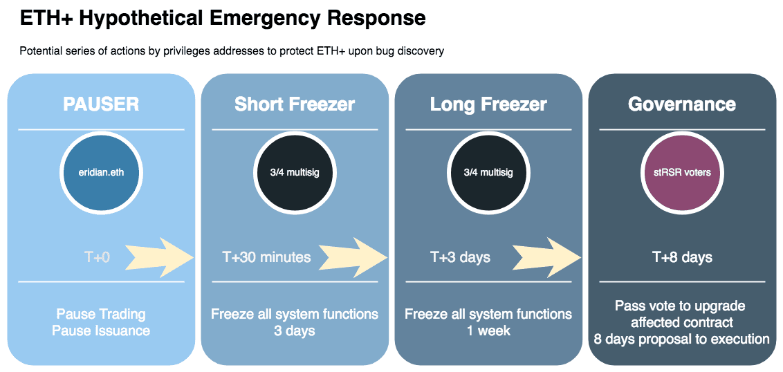 RSR Governance: There is an inherent tradeoff for RTokens to prioritize either growth or robust overcollateralization/diverse stakeholder interest. This is managed through the proportional distribution of revenue to RToken holders versus RSR stakers. ETH+ prioritizes attractive yields to ETH+ holders, and therefore retains a minor (2%) overcollateralization buffer from RSR. This increases the risk of governance takeover, although there does exist a Guardian multisig with veto power and roles to pause protocol functions in an emergency situation. Stakeholders may opt to adjust the revenue distribution in the future to attract additional RSR stakers, although this may diminish ETH+'s competitiveness in the LSD and LSD index market. Regardless of buffer size, note that the existence of any buffer presents a unique value proposition that may not be offered by competing products.