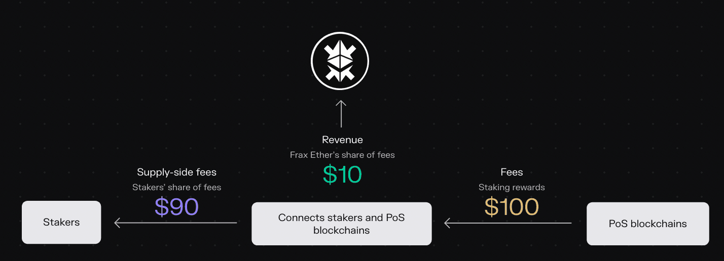 - Frax Staked ETH (sfrxETH): Frax passes 90% of its staking rewards to sfrxETH and retains 10% as a protocol fee.