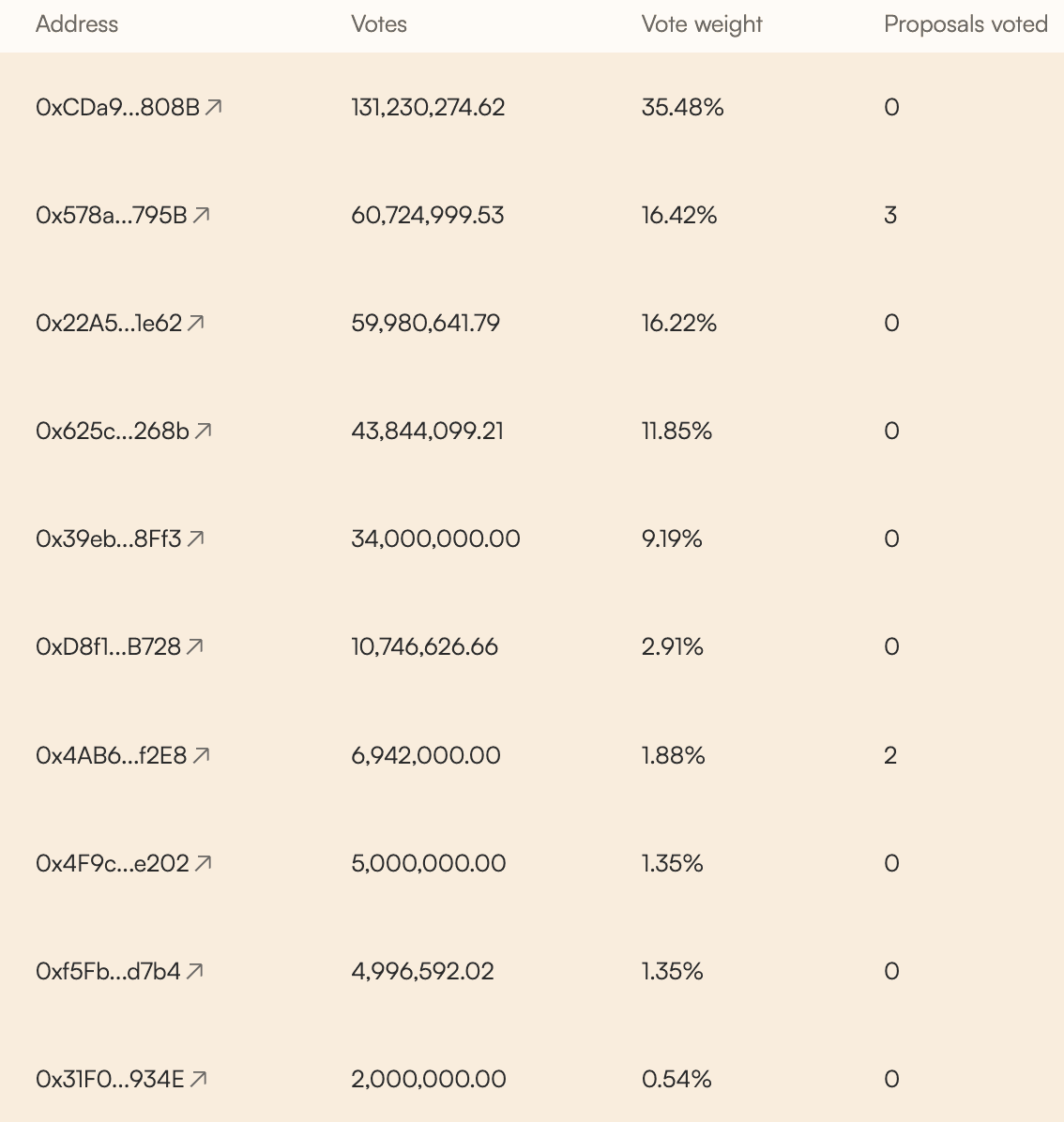 The top four addresses account for about 80% of the total voting power. Here are some more insights:
