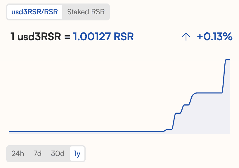 Revenue distribution to RSR staked on USD3 is granted by the increase in the usd3RSR/RSR exchange rate over time, representing the portion of revenue auctioned for RSR and distributed to stakers. The first revenue distribution occurred on May 30, 2024, and as of June 15, 2024, the usd3RSR token has appreciated by around 0.13%.