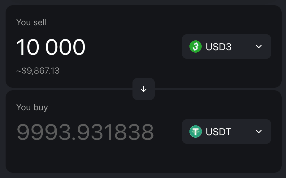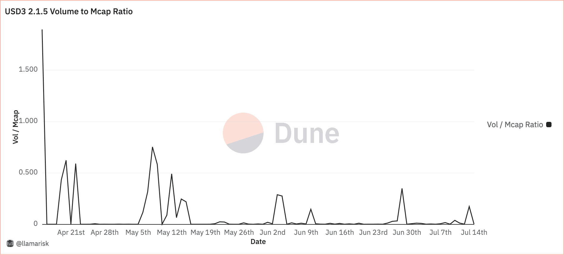 The trading volume to market capitalization ratio provides insight into the liquidity and trading activity of USD3 relative to its total market value. This ratio can indicate how actively the token is being traded in the market.
