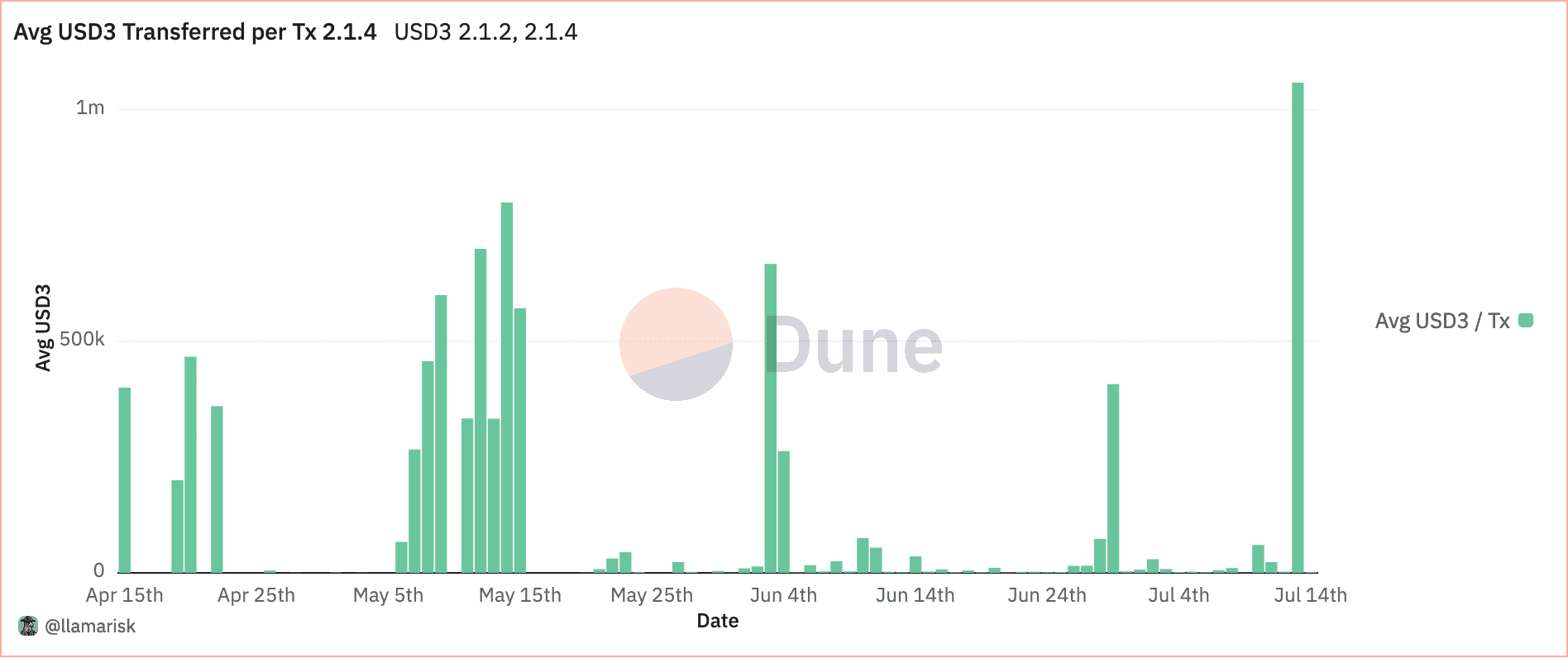 Surprisingly, the average transaction size for USD3 is significantly higher compared to other stablecoins like USDC or USDT. This indicates a preference for larger transactions among USD3 users.