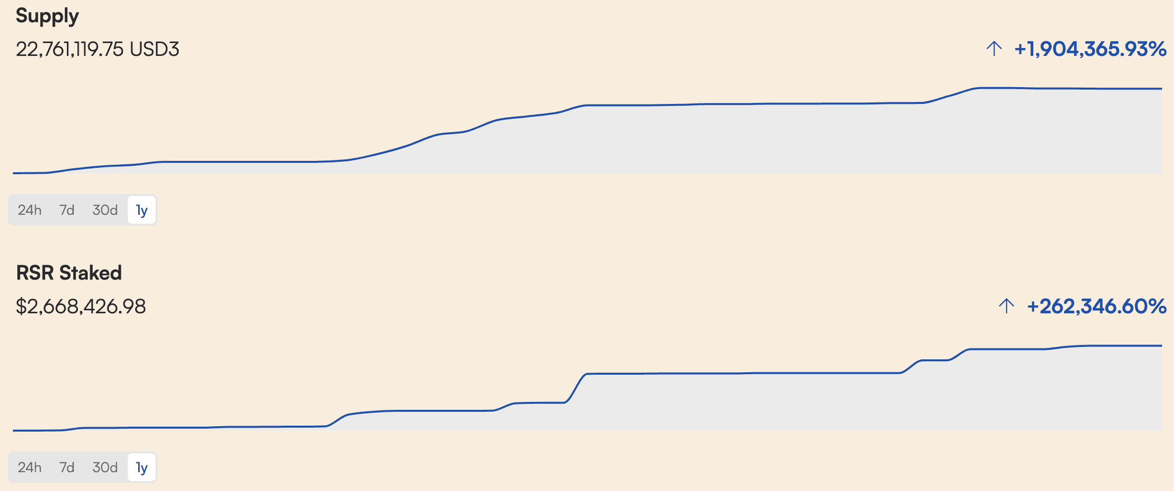 The chart below displays the annualized supply growth along with the amount of RSR staked, leading to the overcollateralization of the stablecoin. Note: These annualized values should be viewed with caution as USD3 is fairly new (2 months old).