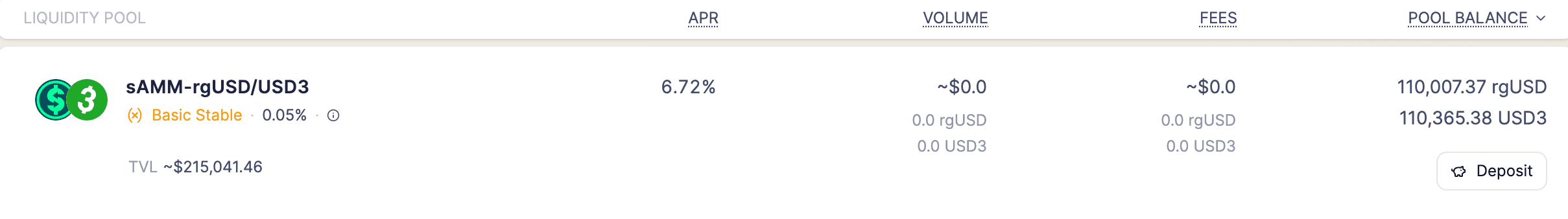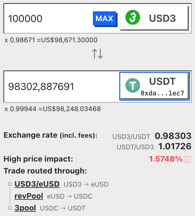 Although USD3 has apparently substantial backing to propel its rapid growth in a short time (it ranks second by TVL in Reserve USD-based RTokens after eUSD), its secondary market is still very much in development. Currently, USD3 is traded on a single DEX (Curve) in several pools paired with other RTokens (eUSD, ETH+, rgUSD). This places greater reliance on the available liquidity for the counterparty assets, which are also emerging assets. However, redemption is readily available directly from the protocol for an equal value of the underlying basket assets.