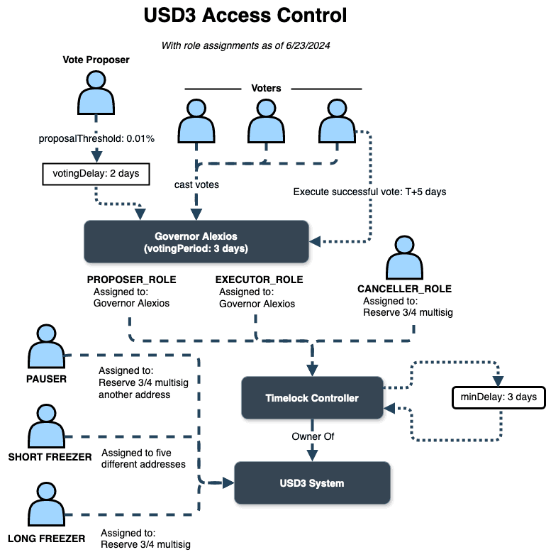 The USD3 governance system operates through a structure designed to balance security and adaptability. Stakeholders can alter properties of USD3, including: