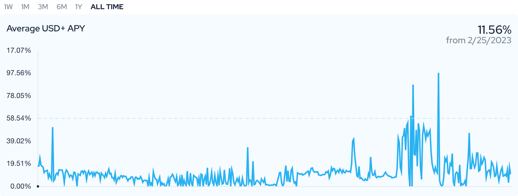 Additionally, USD3 also underperforms compared to USD+ (Arbitrum), which has a 30-day average yield of 13.65% and a lifetime average of 11.56% (Note that this is self-reported yield data from OvernightFi itself). USD+ similarly employs strategies to earn yield on underlying stablecoins, although it has sophisticated hedging strategies that may not be viable in all market conditions. 2/3 of its underlying portfolio is in delta-neutral BTC and ETH perpetual futures strategies. Below is the lifetime APY of USD+ (Arbitrum) since February 25, 2023.