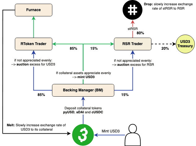 When minting new USD3, the underlying assets are stored in the Backing Manager (BM) contract. This contract holds the assets, mints more USD3, or trades for more USD3 or RSR tokens. As the value of the underlying assets increases over time, the Backing Manager mints additional USD3 tokens whenever possible. Since the reward rates of the underlying assets vary, the value of individual underlying assets does not increase equally. Accumulated spare value, which cannot be used for minting new USD3 (because the mint process requires the use of the equal value of underlying tokens), is auctioned by selling the accrued assets for USD3 tokens.