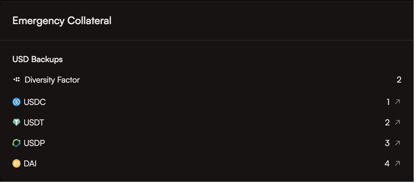 In case any basket asset were to default from a sustained depeg, the protocol would sell the defaulted collateral for one of the predesignated emergency collateral types: