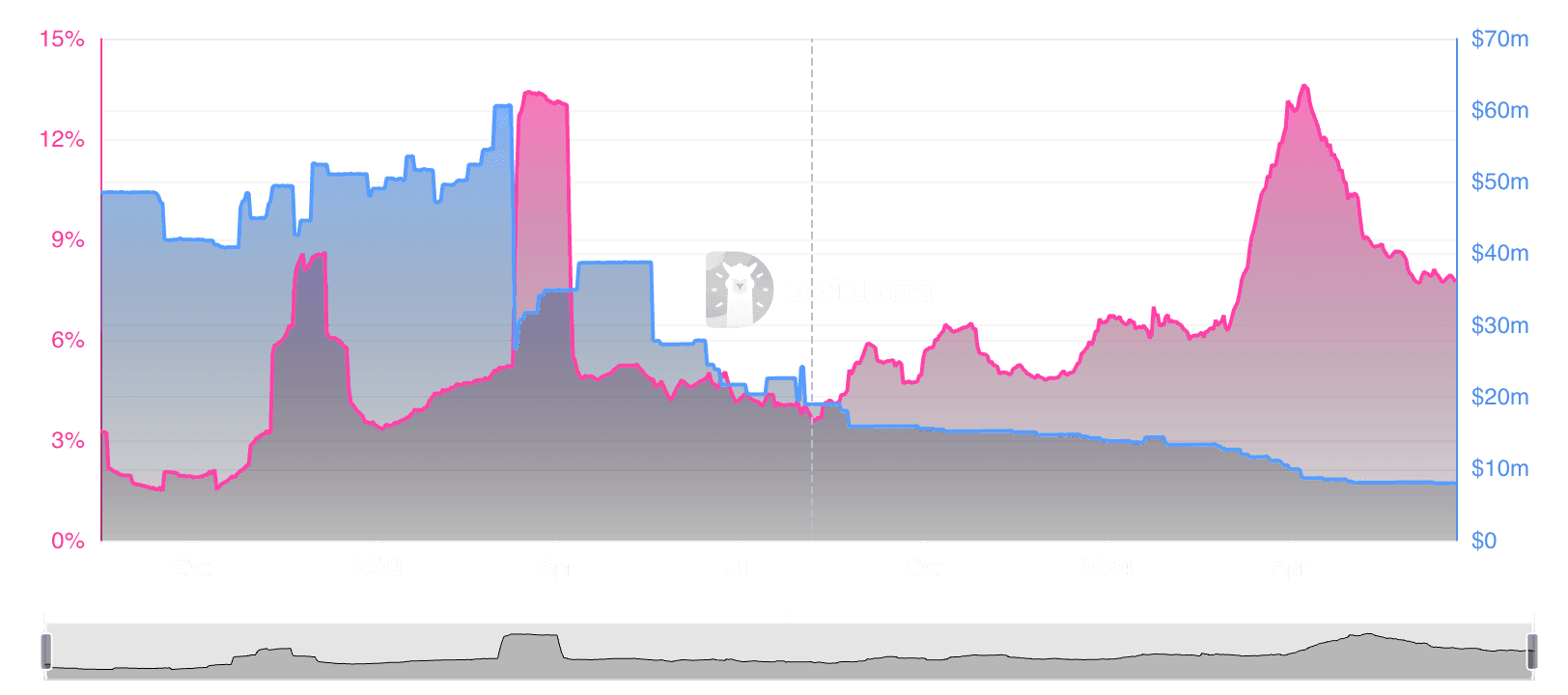 According to DefiLlama, OUSD offers a 30-day average APY of 8.00%. However, this yield is highly volatile, fluctuating between 12% and 1.6%, as depicted in the graph below: