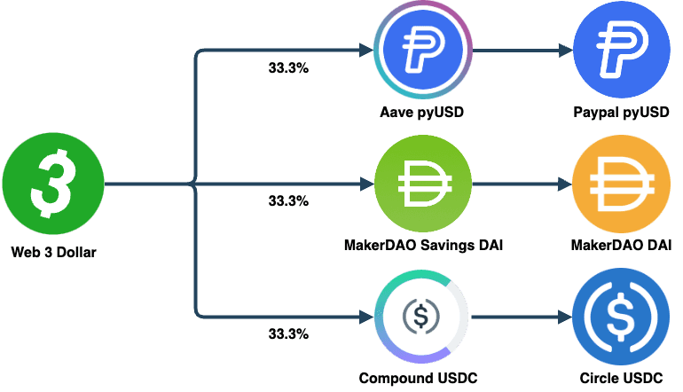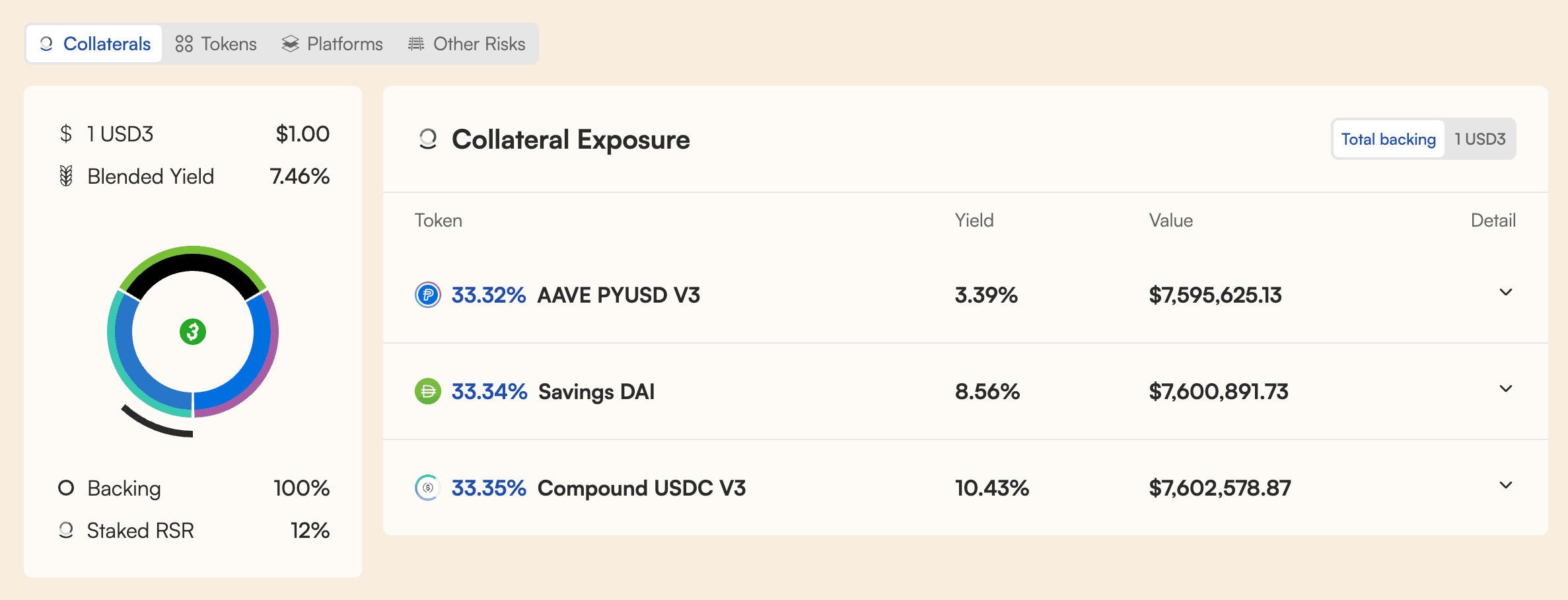 The collateral basket of USD3 currently consists of the following three assets, each with an equal target rate of 33%: