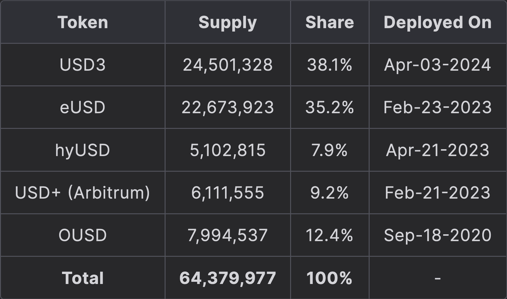 As USD3 is a yield-bearing USD stablecoin collateralized by different stablecoins, it makes the most sense to compare it to similar tokens. Due to the scarcity of other stablecoins backed by multiple stablecoins, we compare USD3 directly to other RTokens. Another similar product is OUSD from the Origin Protocol.