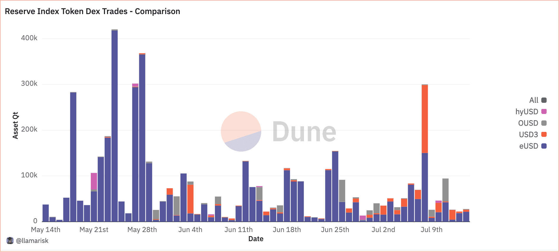 Below is the quantity of DEX volume for USD3 compared to other USD index tokens.