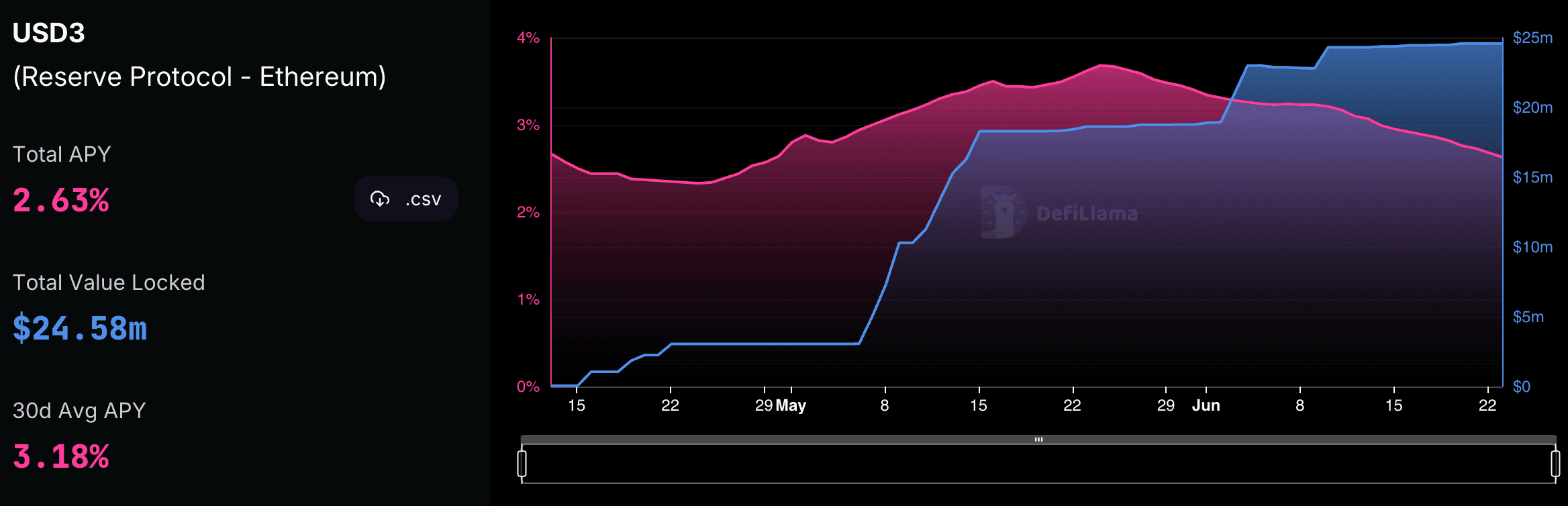 The yield for USD3 is derived from the average returns of its underlying USD stablecoin collaterals, minus a 15% fee allocated to stRSR (to provide governance and overcollateralization) and the USD3 treasury. As of June 23, 2024, DefiLlama reports the average 30-day APY for USD3 at 3.18%. The chart below illustrates the USD3 APY and Total Value Locked (TVL) from the beginning of March onwards: