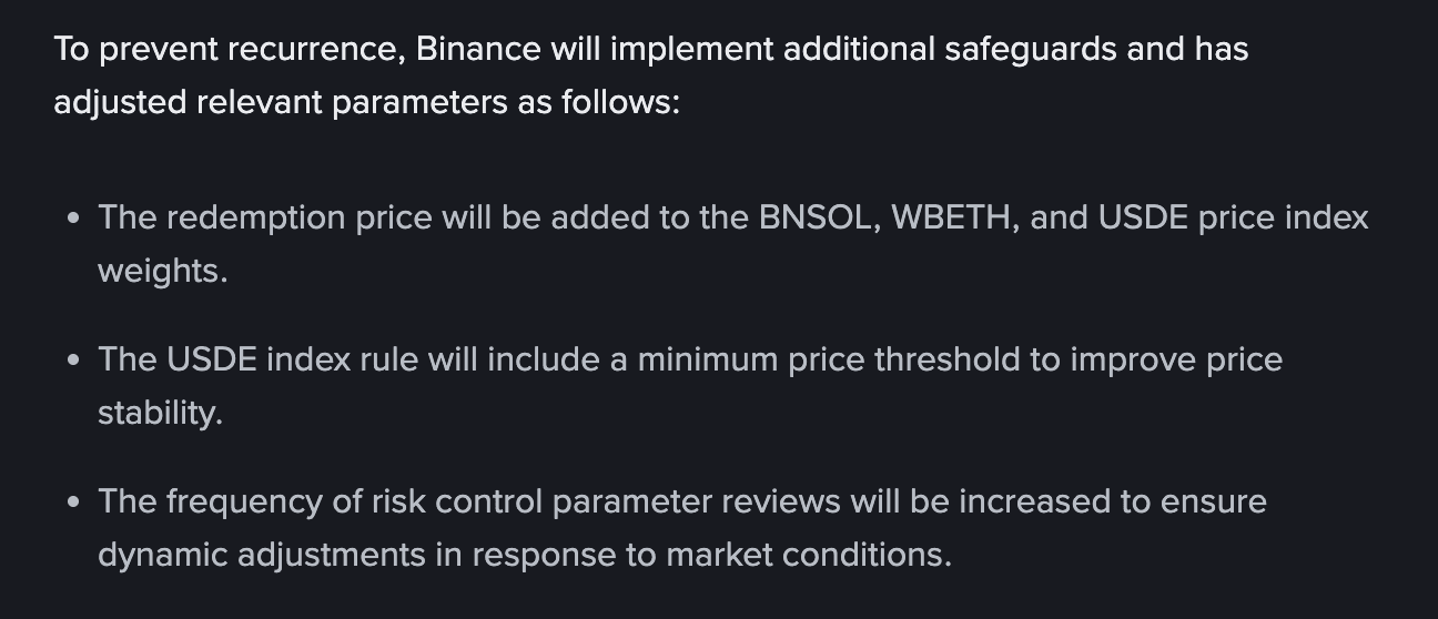 In the aftermath, Binance effectively confirmed this analysis in its official communication titled, "Resolution of USDE, BNSOL, and WBETH Price Depeg and Risk Control Enhancements." The exchange acknowledged "platform-related issues" and announced it would "compensate all impacted Futures, Margin and Loan users within 72 hours."