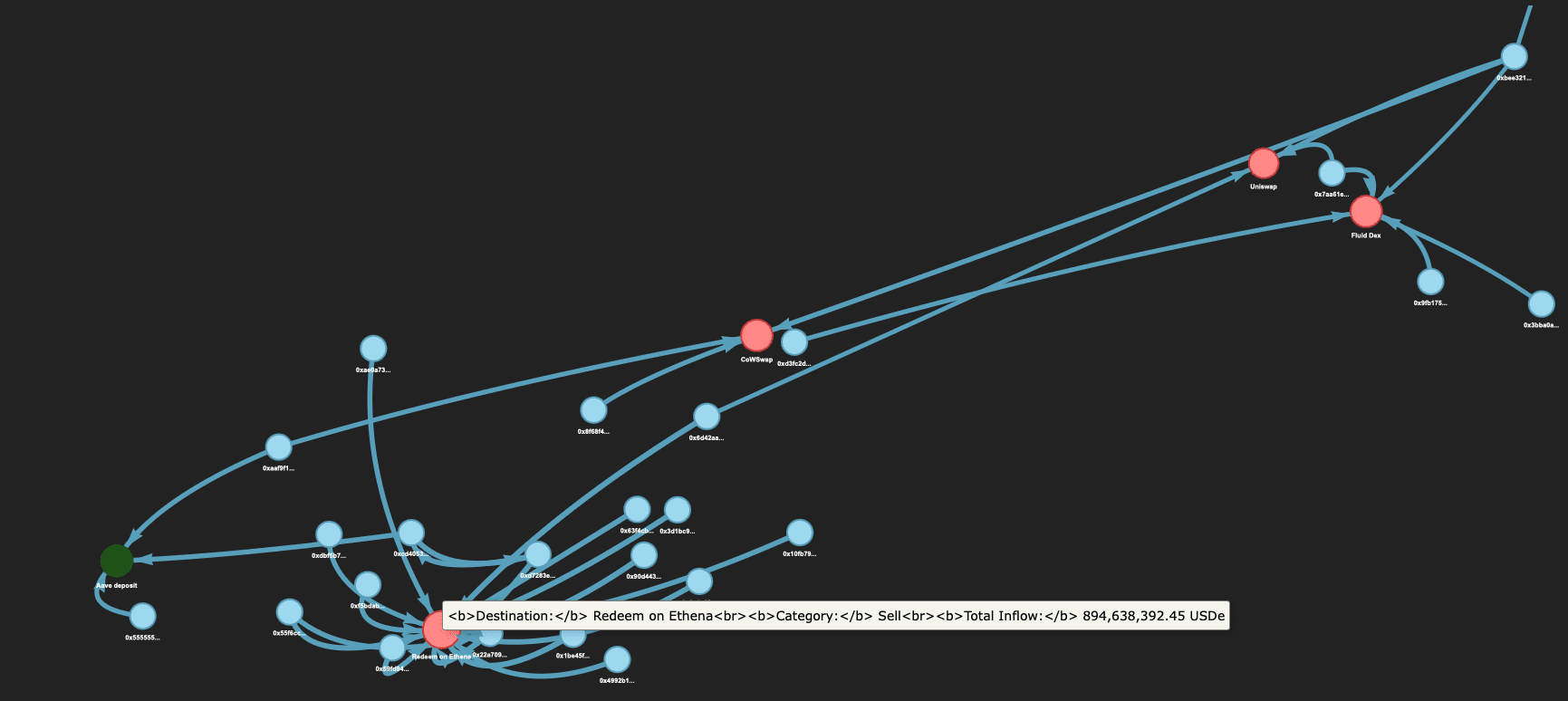 In this graph we only show the addresses that withdrawn from Binance and then redeemed on Ethena, which processed nearly $900 million in redemptions, deposited into Aave (~$20M) or sold on various DEXs (~$40M).