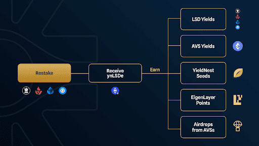 Both nLRTs and LRTs are delegated to provide security for various RAs across restaking platforms while enabling trading opportunities within the DeFi ecosystem. As shown in the ynETHx diagram above, an example of nLRTs and LRTs can be seen in ynETH and ynLSDe, respectively, which both play a crucial role in forming the restaking strategies for ynETHx.